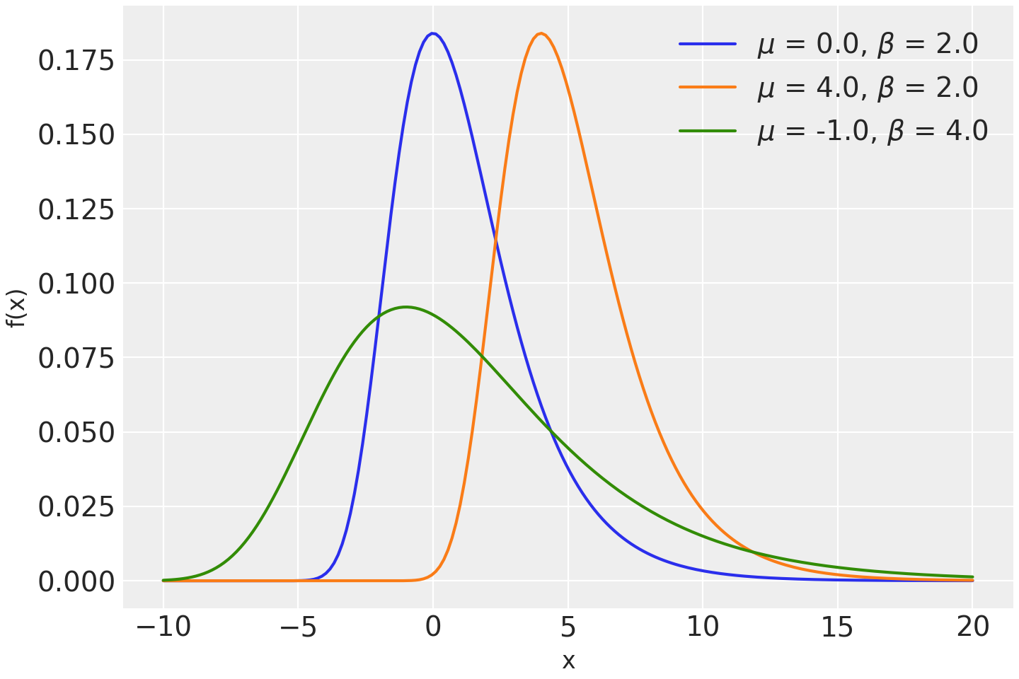 \[f(x \mid \mu, \beta) = \frac{1}{\beta}e^{-(z + e^{-z})}\]